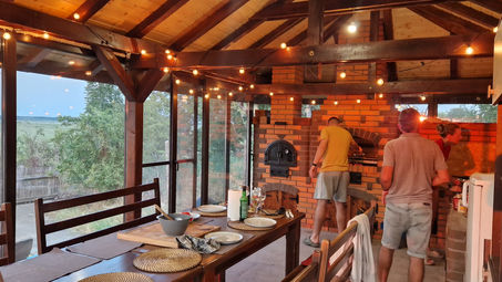Our outdoor kitchen is fully equipped with everything you need for outdoor meals: plates, cutlery, glasses, knives, a grill, a pizza oven, sink, refrigerator, freezer, two large tables with chairs and benches, and even firewood. Plus, you can enjoy a stunning view of the lake and the Danube Delta. The fully equipped outdoor kitchen is available for all our guests to use—whether you're staying in one of the glamping tents or in the main house.